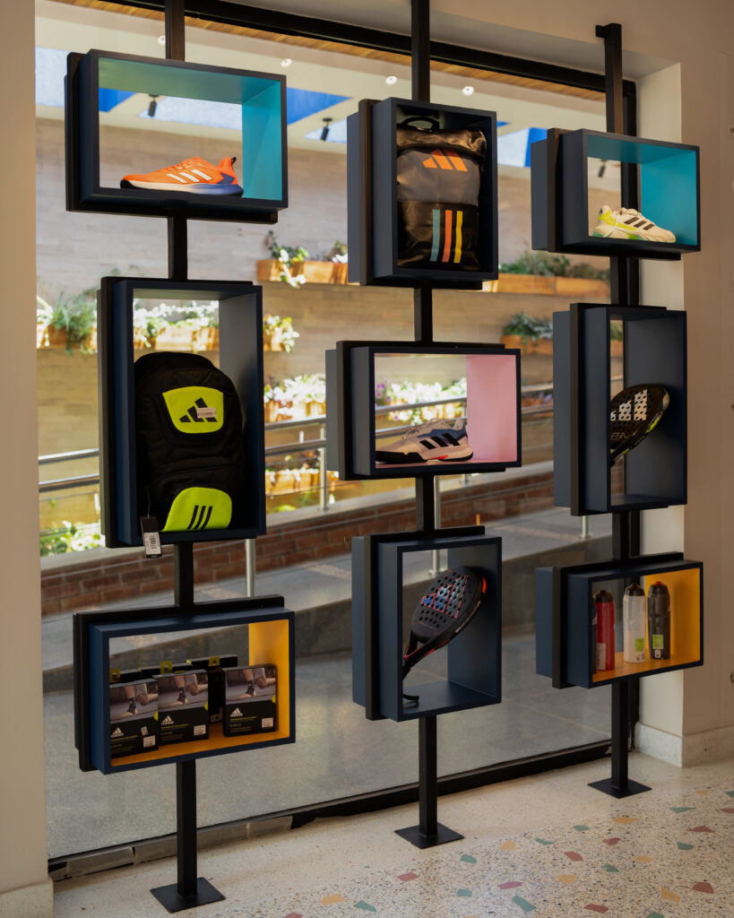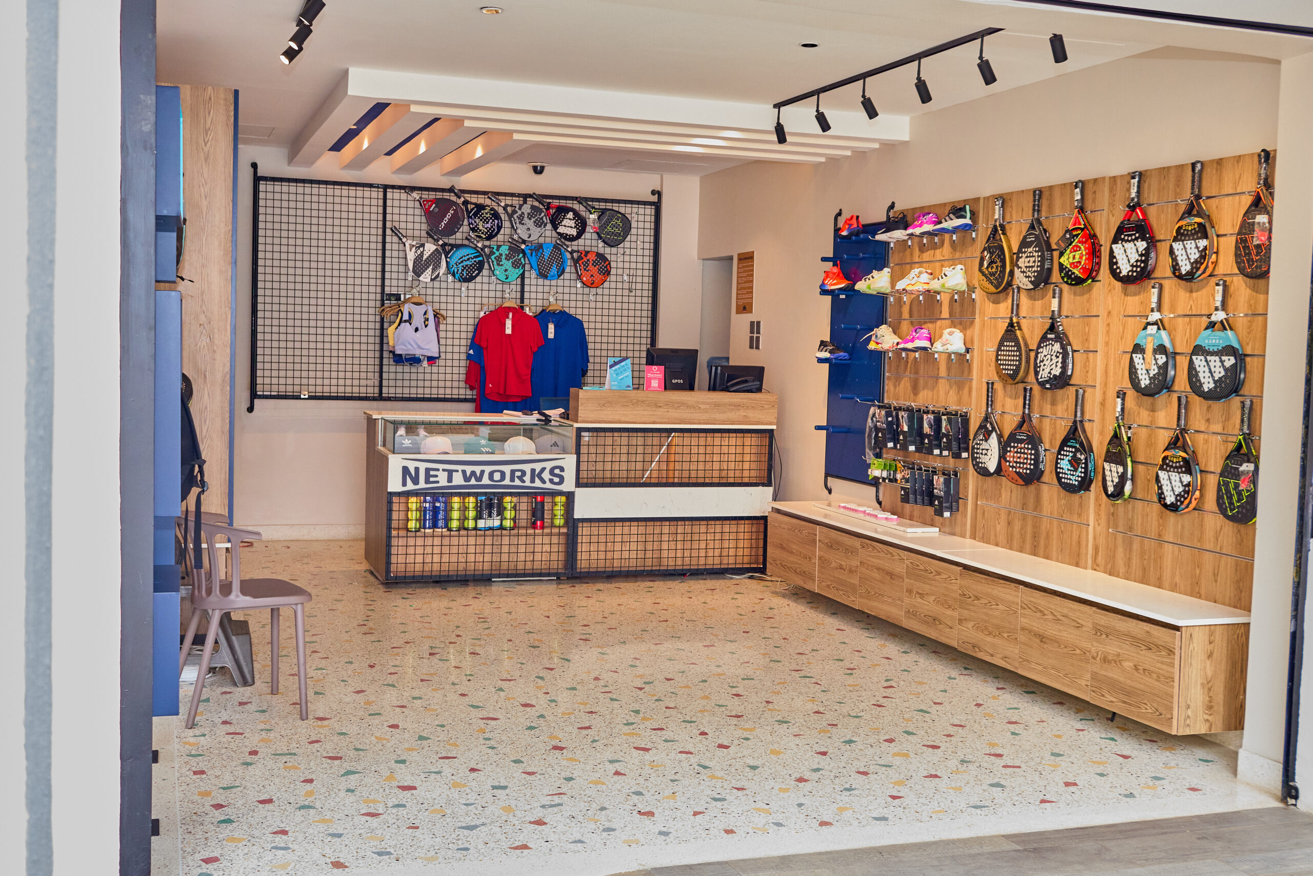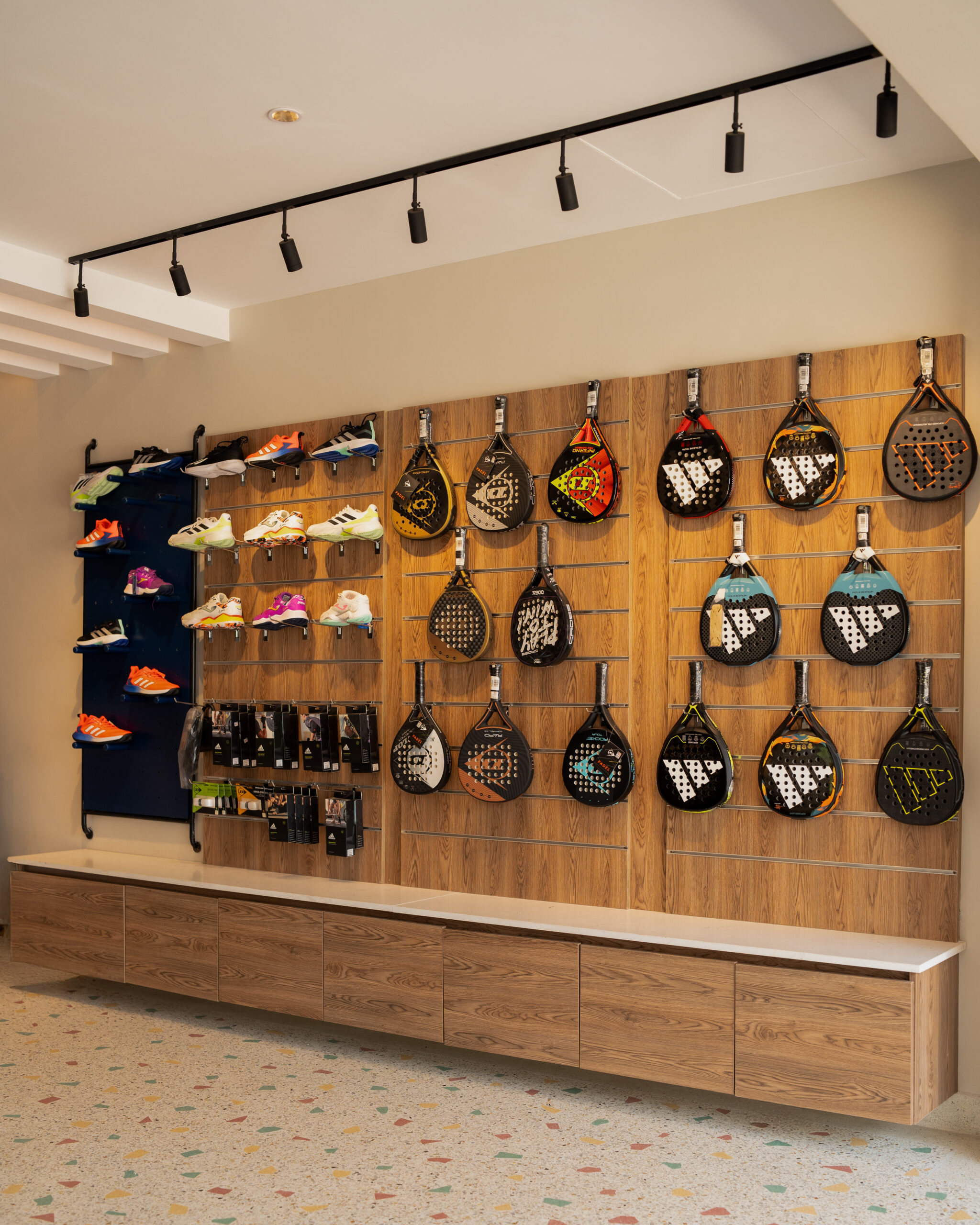 The project also incorporates a modern retail section, showcasing sports gear and padel accessories with stylish wall displays and clean shelving systems. The retail space is well-lit and organized, offering a premium shopping experience for athletes and enthusiasts.