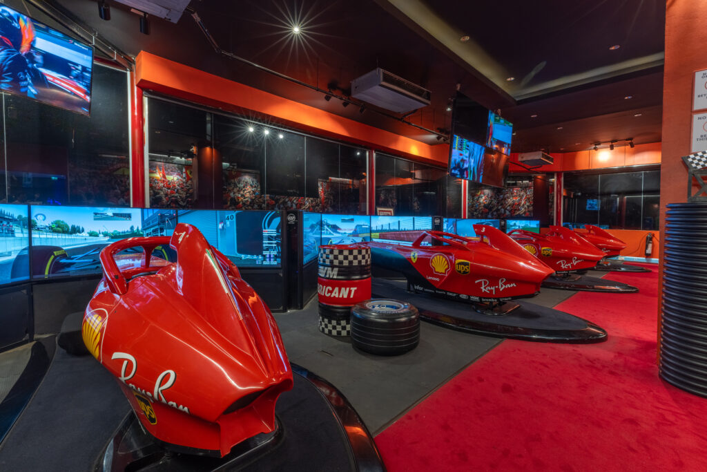 The interior aesthetic is intentionally dramatic. Deep tones, vibrant red accents, and illuminated surfaces work together to mirror the adrenaline of high-speed racing. Integrated lighting systems enhance depth and atmosphere, responding naturally to the environment and reinforcing the immersive nature of the virtual experience. Every visual element was selected to heighten excitement while maintaining balance and control within the space.